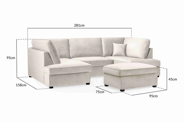 - Generous Dimensions: Its spacious U-shape corner measuring W 281 x L 158 x L 158cm X H95 cm ensures that there’s ample space for your family and guests. The sofa’s height of 48 cm from the seat to the floor offers an optimal sitting experience for relaxation.